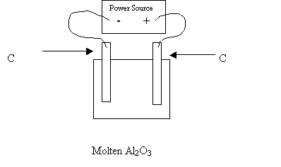 Pure Al is reduced at the cathode from molten bauxite (Al2O3). |