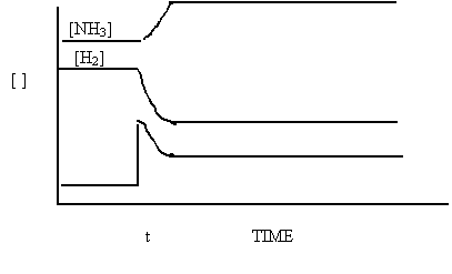 A 1.00 L container is filled with 7.0 mole NH3 and the system proceeds to equilibrium as indicated by the graph.